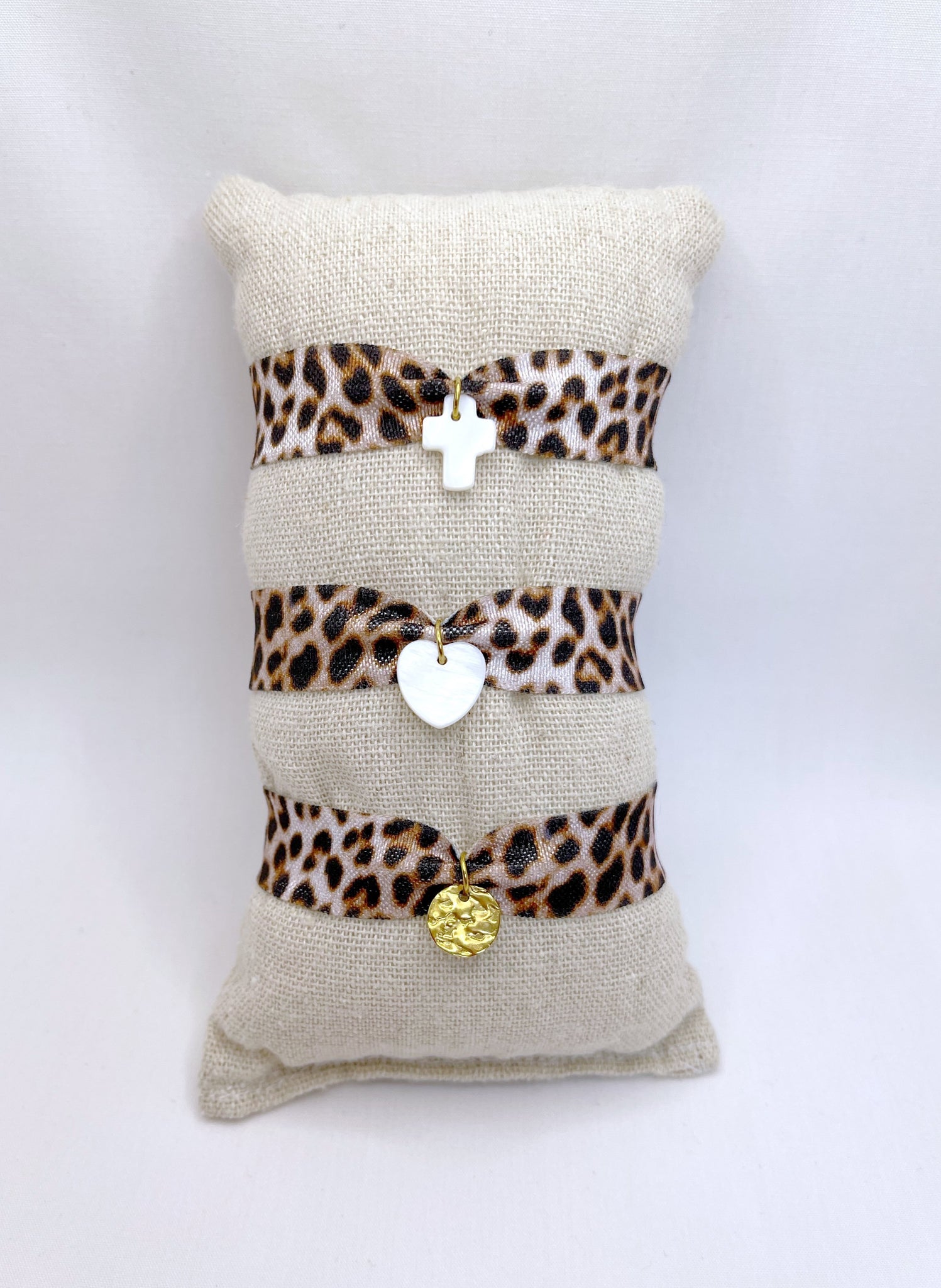 - Élastique, breloque ronde en acier inoxydable / coeur et croix en nacre